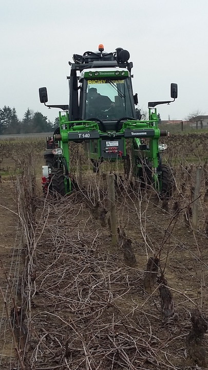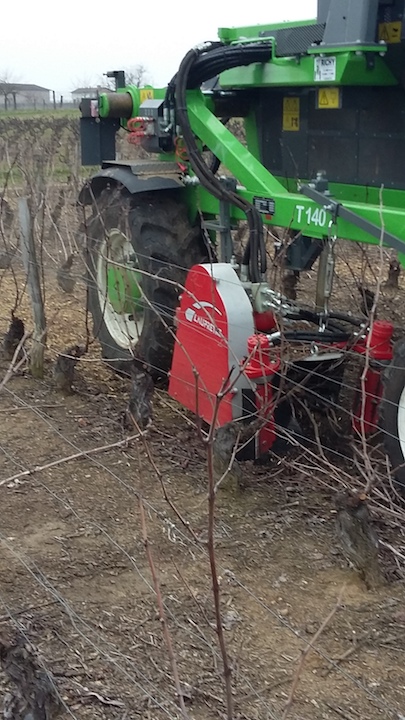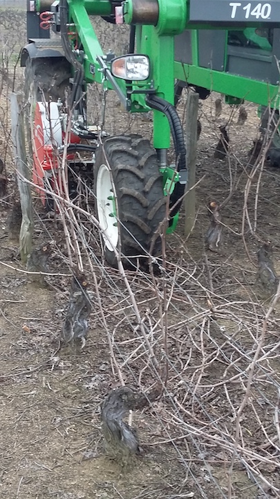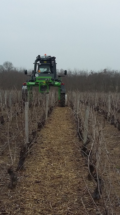 Lorsque l’on a fini la période des taillages, nous allons broyer les sarments, mis à terre lors de la taille. Ceux-ci apportent ainsi de l’humus dans le sol, ce qui représente 50% des besoins annuels de la vigne.